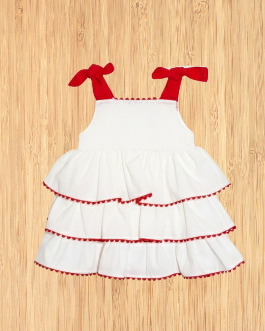 Vestido encantador em camadas, perfeito para ocasiões especiais. O modelo clássico combina a elegância do off white com o charme dos detalhes em vermelho, criando um visual delicado e atemporal para as pequenas.